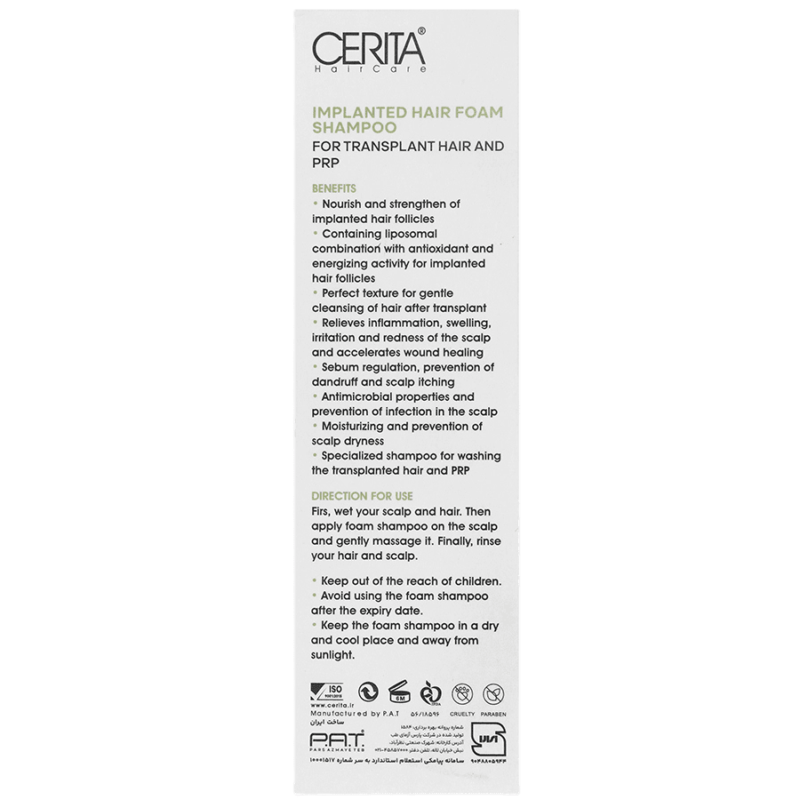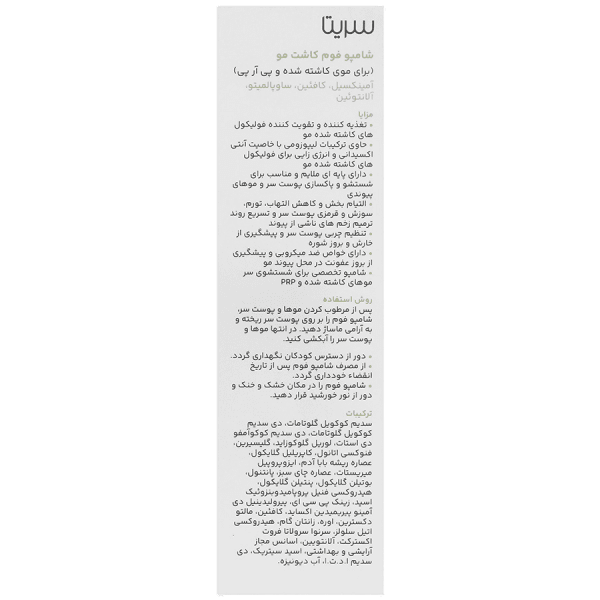 شامپو فوم کاشت مو سریتا، بهطور ویژه برای مراقبتهای پس از کاشت مو و تقویت فولیکولهای تازه کاشته شده طراحی شده است تا موفقیت کاشت مو را افزایش دهد. بافت فوم این محصول به گونهای طراحی شده که بدون ایجاد چسبندگی یا تحریک، به راحتی جذب پوست سر میشود. این شامپو با تسریع بهبود زخمهای ناشی از پیوند مو، به روند بهبودی آن کمک میکند. همچنین، با تنظیم چربی پوست سر، از خارش و شوره جلوگیری میکند. این فوم شستوشوی تخصصی برای موهای کاشته شده، PRP و مزوتراپی مناسب است.